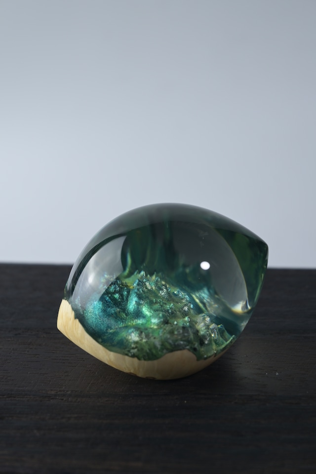 【作品イメージ】 木とレジンで猫の瞳をイメージした作品。 猫が見てきた幻想的な景色を閉じ込めました。 内部のごつごつしている部分は 木が何十年もかけて作りだした瘤の表面です。 唯一無二の造形美をお楽しみください。 以前よりサイズが小さくなり飾りやすくなりました! デスクや棚に置きやすいサイズとなっています。 【使用レジン】 レジンは2液レジンを使用しています。 木材に染み込んだレジン液も硬化しており、使用時に滲み出て衣服を汚したり、肌に付着する心配はありません。 【使用木材】 メイプルバール 【木の仕上げ方法】 浸透性の高級セラミックオイルで仕上げています ・汗や水は染み込みません ・木の温もりある肌触りはそのままです ・木の強度アップ ・オイルの再塗布不要 【専用の箱付き】 ロゴが箔押しされた専用の箱に入れてお届けいたします。 高級感のある箱で作品の保管にも プレゼント用の箱にもご使用できます。 【各サイズ】 縦 約4.5cm 横 約5cm 奥行 4.5cm #ウッドレジン #ウッドアンドレジン #ウッド #レジン #オブジェ #木の置物 #ハンドメイド #プレゼント #ご褒美 #記念日 #ねこの幸福屋