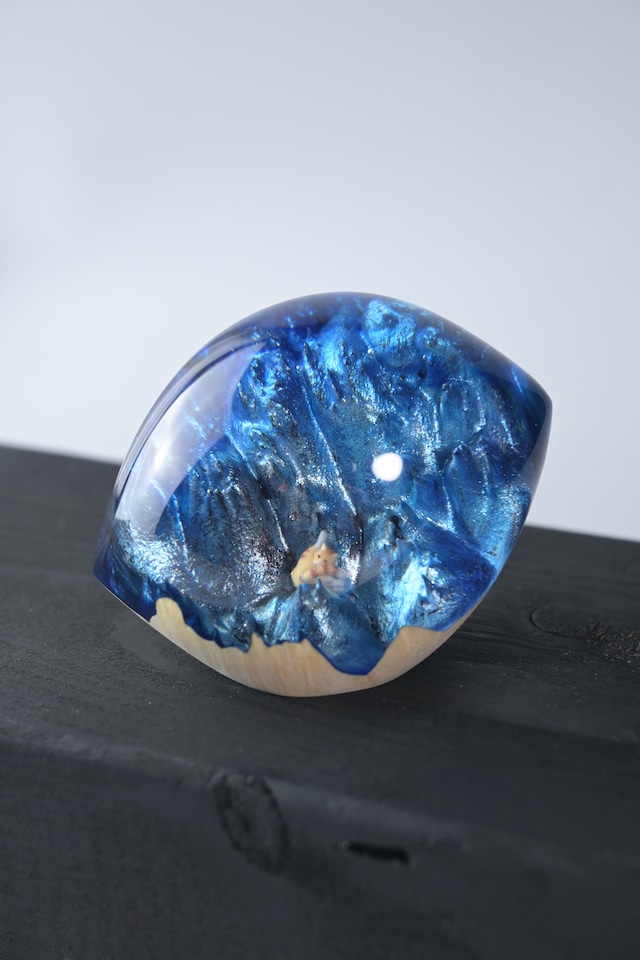 【作品イメージ】 縄張りの中は変化がなく いつも安全で いつも穏やか このまま年をとるのだろうと 諦めるように生きていた猫たち ふと見えたのは美しい外の世界 変わらない毎日を変えるため まだ見ぬ世界を見るため 本当の自分を見つけるため それぞれの理想を手に入れるため 小さな猫たちは勇気をもって縄張りから一歩踏み出しました 【使用レジン】 レジンは2液レジンを使用しています。 木材に染み込んだレジン液も硬化しており、使用時に滲み出て衣服を汚したり、肌に付着する心配はありません。 【使用木材】 メイプルバール 海外のカエデの木にできた瘤状の木材。 不規則な木目と表面が特徴で、稀に発生する為、高価な木材。 その美しさからギターやヴァイオリンなどの楽器や、工芸品にも使用されている。 【カラー区分】 青 【木の仕上げ方法】 浸透性の高級セラミックオイルで仕上げています ・汗や水は染み込みません ・木の温もりある肌触りはそのままです ・木の強度アップ ・オイルの再塗布不要 【各サイズ】 縦 約4.5cm 横 約5cm 奥行 4.5cm #ウッドレジン #ウッドアンドレジン #ウッド #レジン #オブジェ #木の置物 #ハンドメイド #プレゼント #ご褒美 #記念日 #ねこの幸福屋