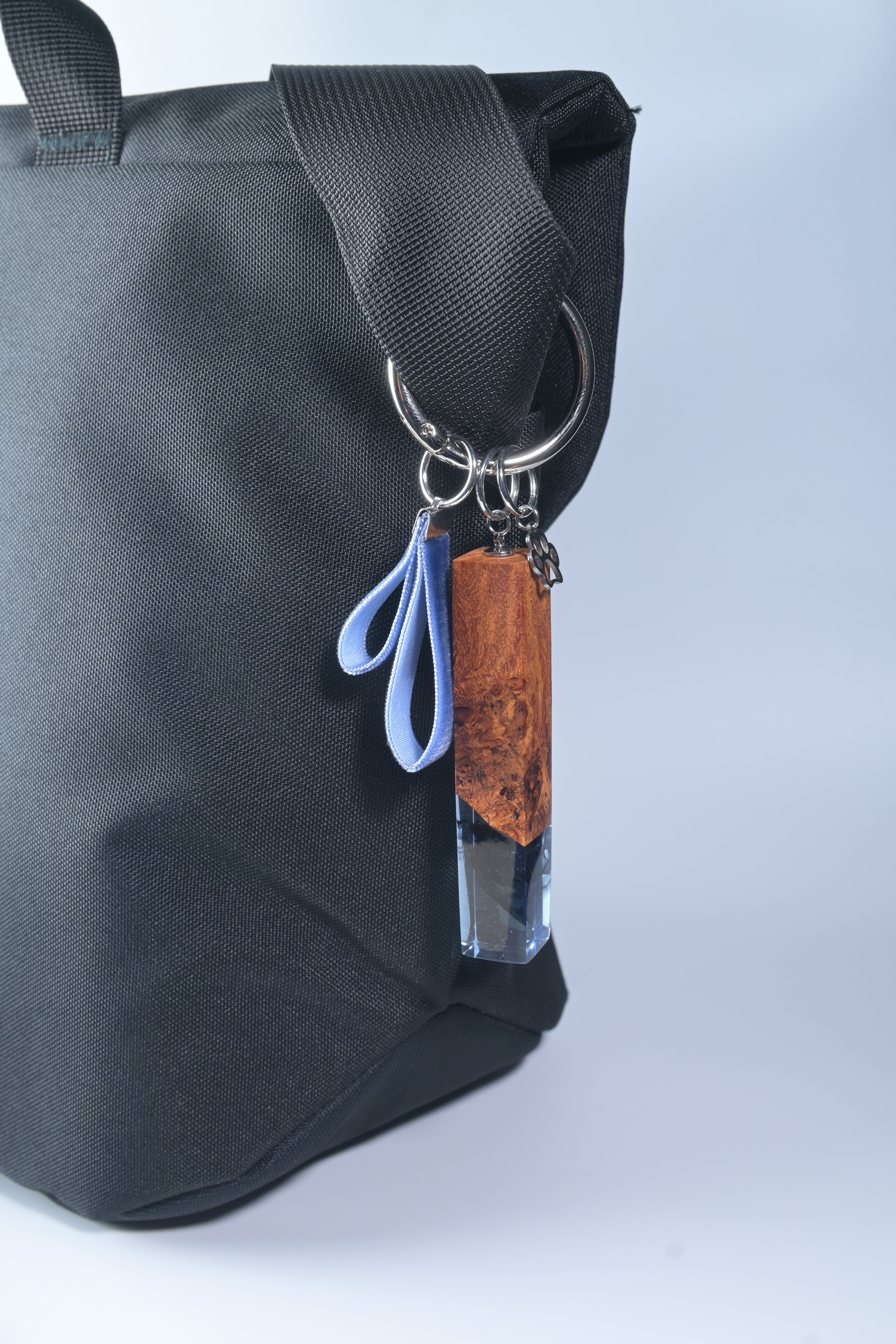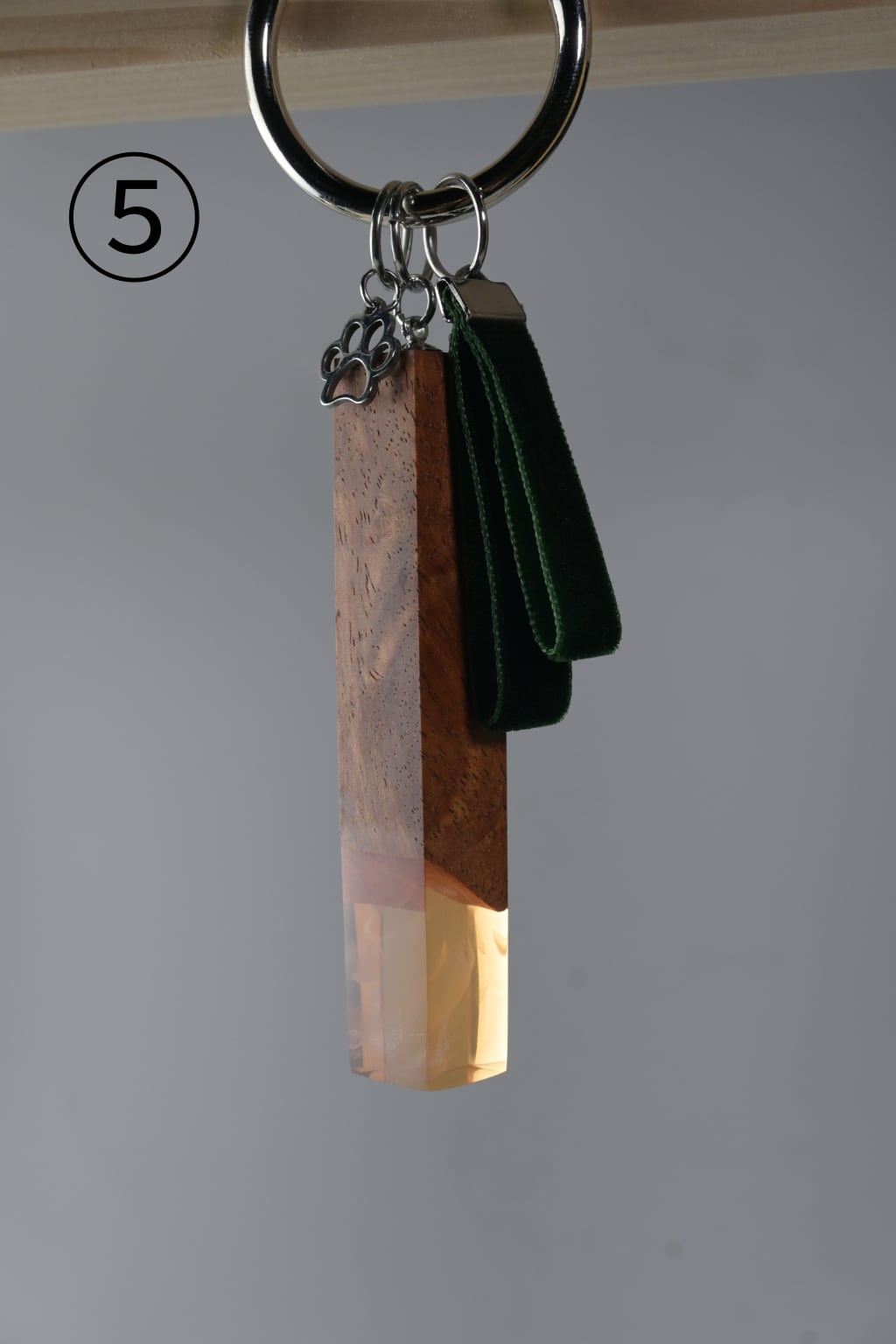 木とレジンを使い、猫の尻尾をイメージしたバッグチャームです。