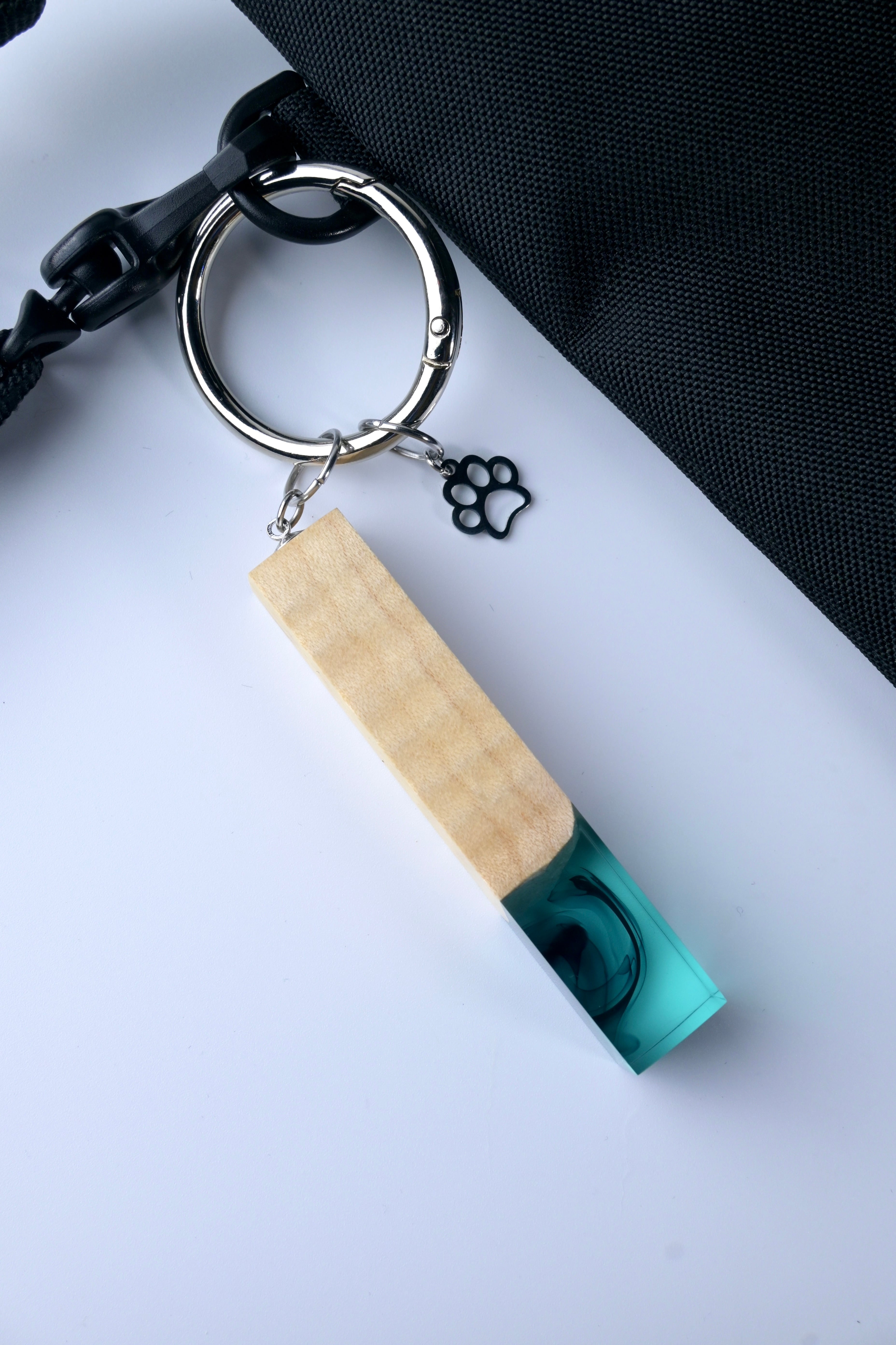 木とレジンを使い、猫の尻尾をイメージしたバッグチャームです